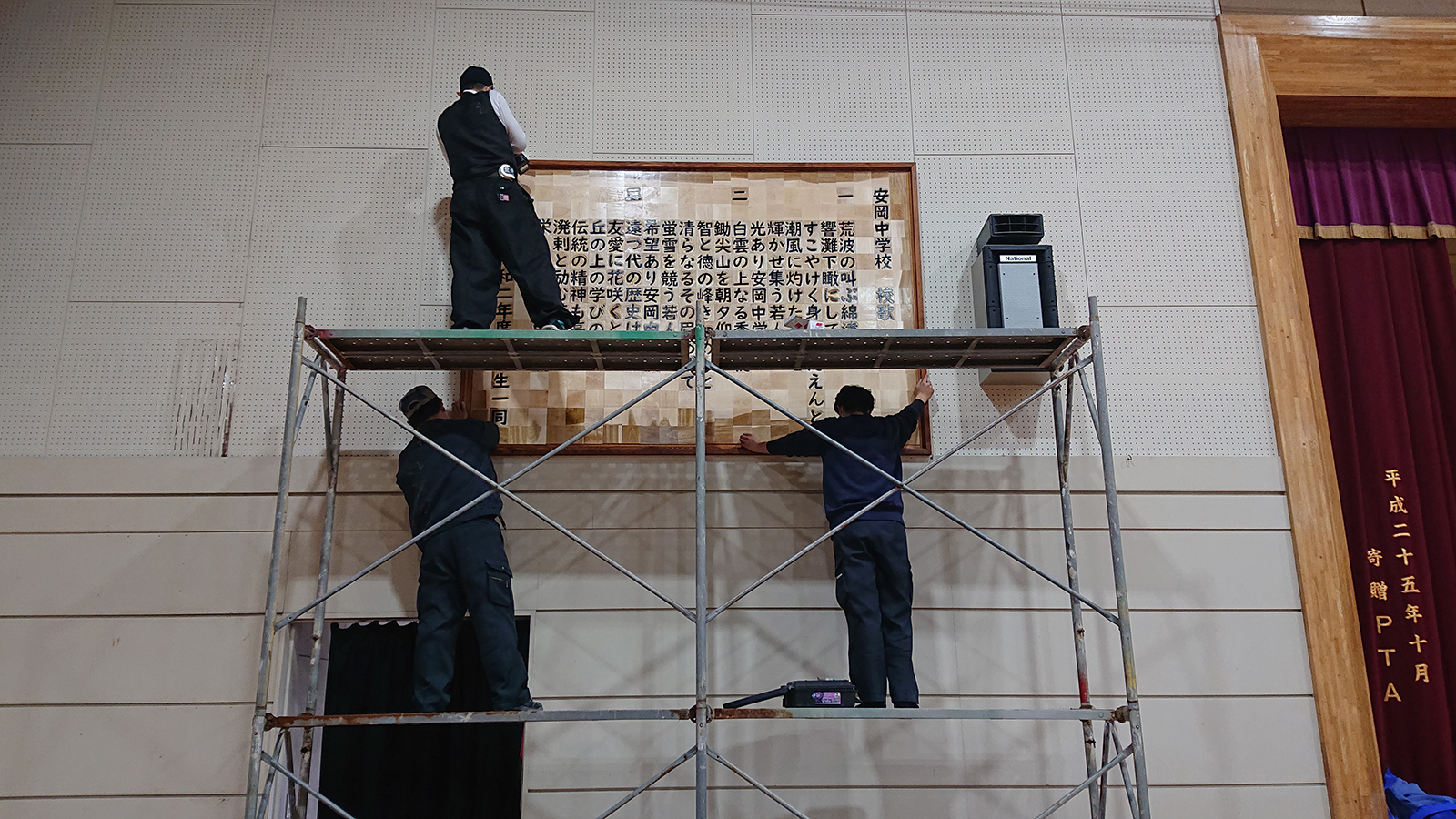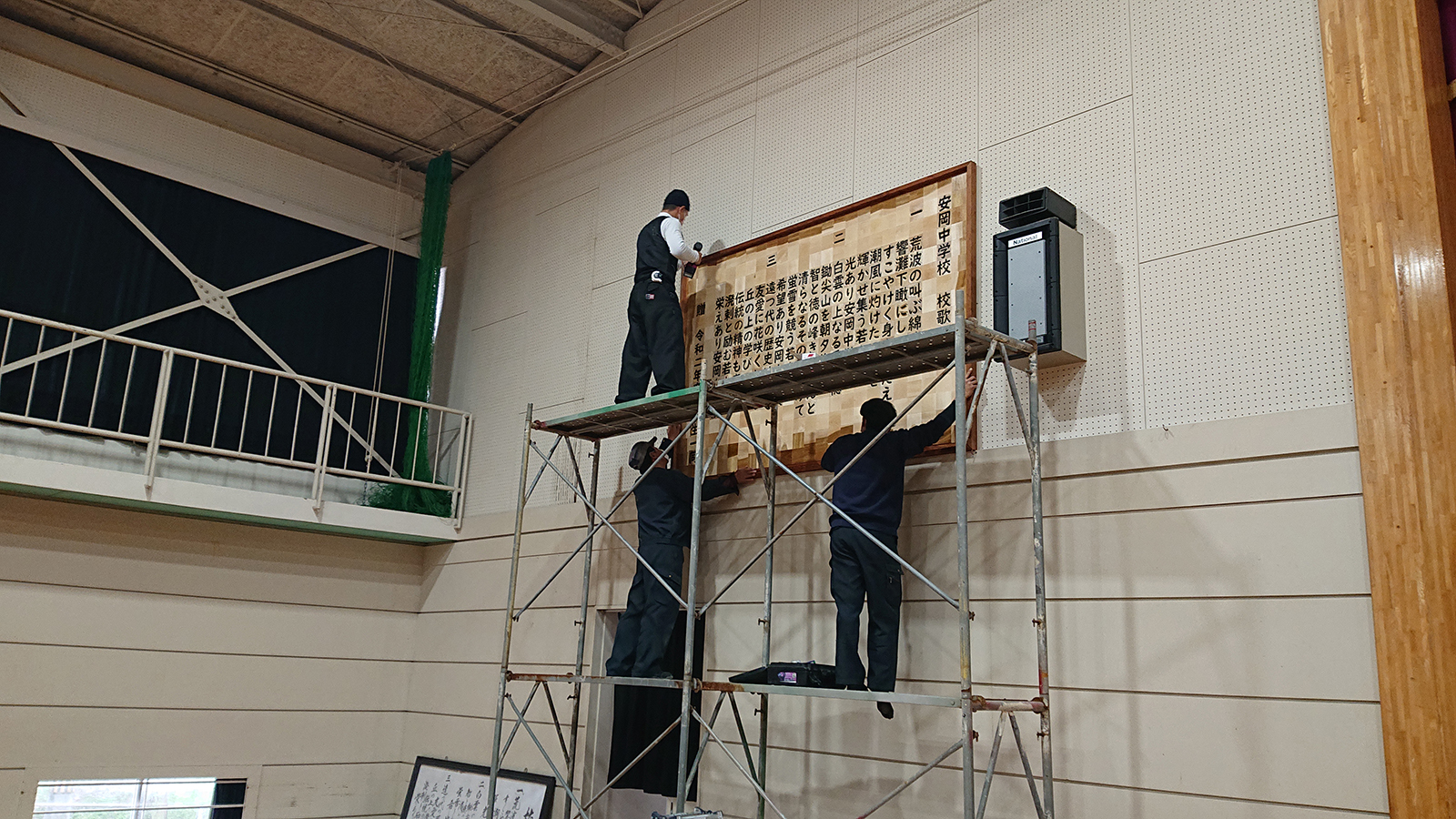 今回は、この大きな作品を飾る額の制作と体育館の壁への取り付け作業をお引き受けすることになりました。